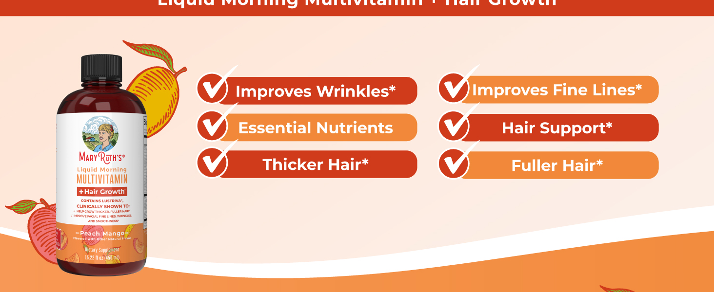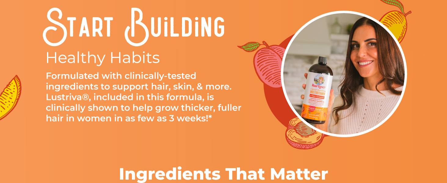 Our best-selling multivitamin to support your beauty from within! With clinically shown Lustriva®, this delicious liquid multivitamin helps support thicker, fuller hair and smoother skin in women — while also delivering daily wellness support with essential nutrients to support energy metabolism, immunity, and more.